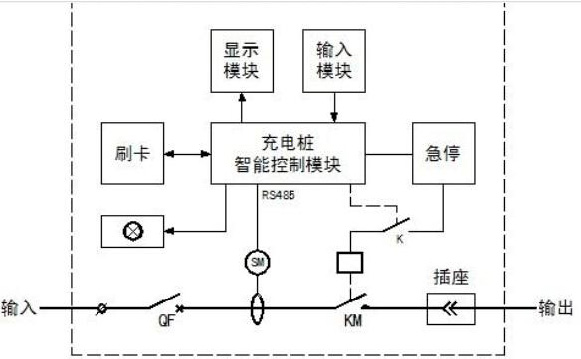 交流充電樁電氣系統(tǒng)如圖 2所示,主回路由輸入保護斷路器、交流智能電能表、交流控制接觸器和充電接口連接器組成;二次回路由控制繼電器、急停按鈕、運行狀態(tài)指示燈、充電樁智能控制器和人機交互設(shè)備(顯示、輸入、刷卡)組成。